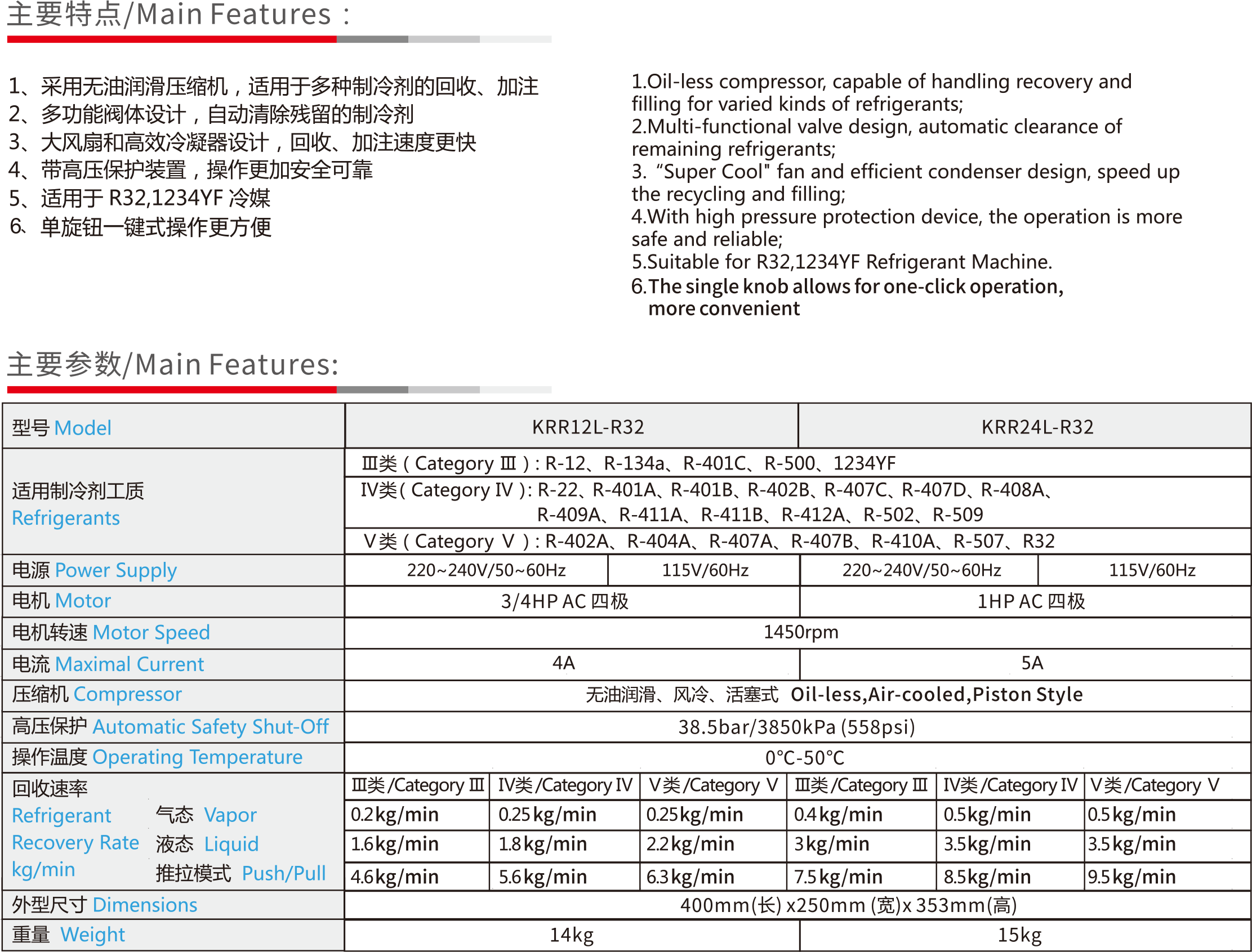 Single Knob Refrigerant Recovery Machine R32